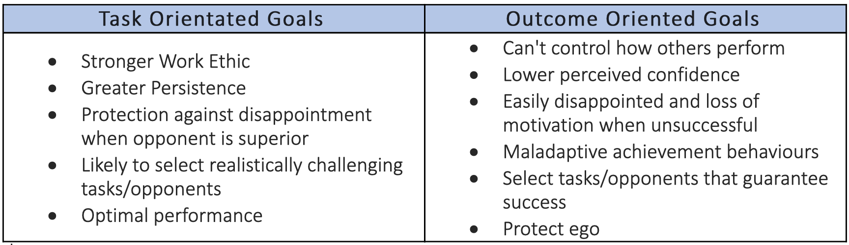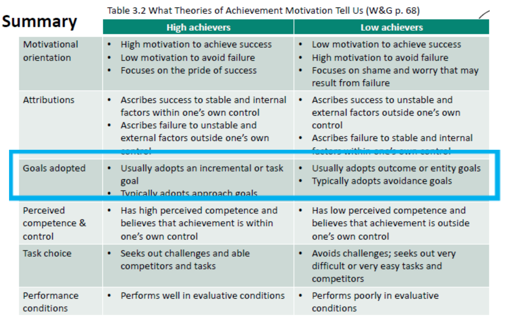 Goals - the goals we set for ourselves can significantly dictate the type of motivation we develop, the scenarios we seek, and our performance outcomes