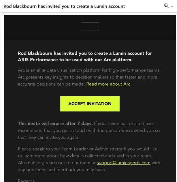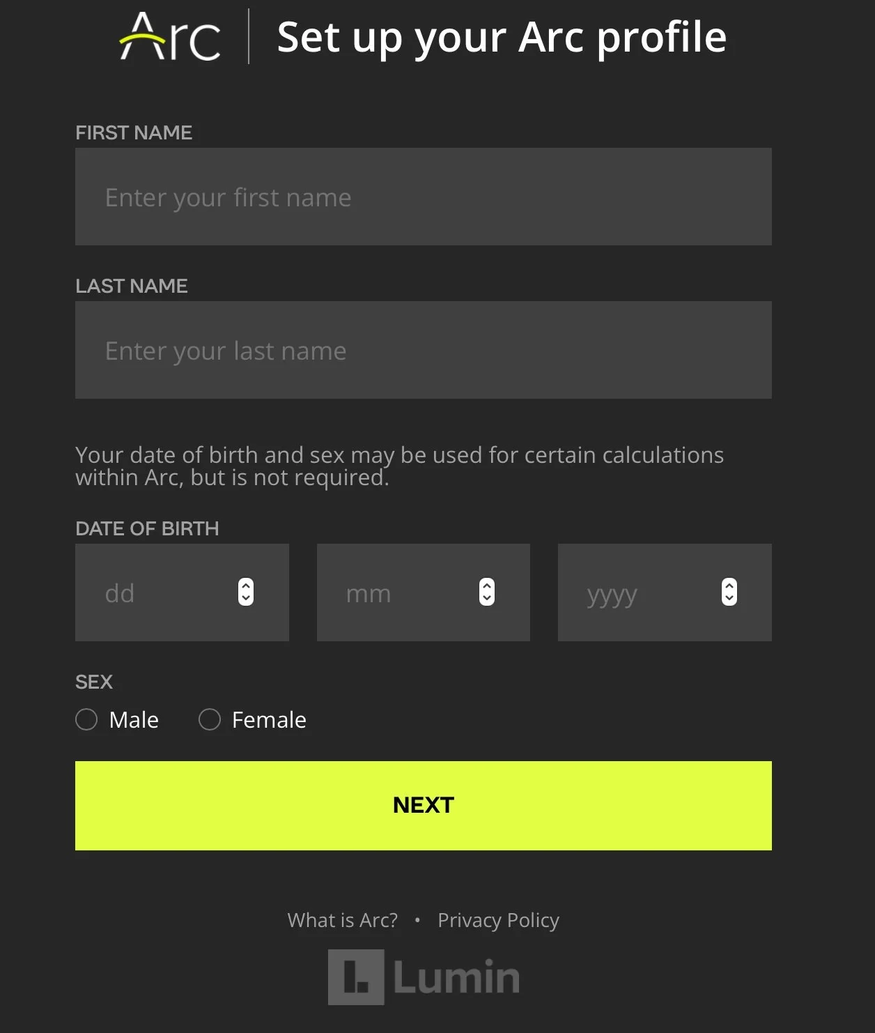 Complete the details and password pages to finalise your registration with Lumin Arc - upon completion please download the app from either Apple App Store or Google Play Store; as you will need this to complete your wellness and training load questionnaires.